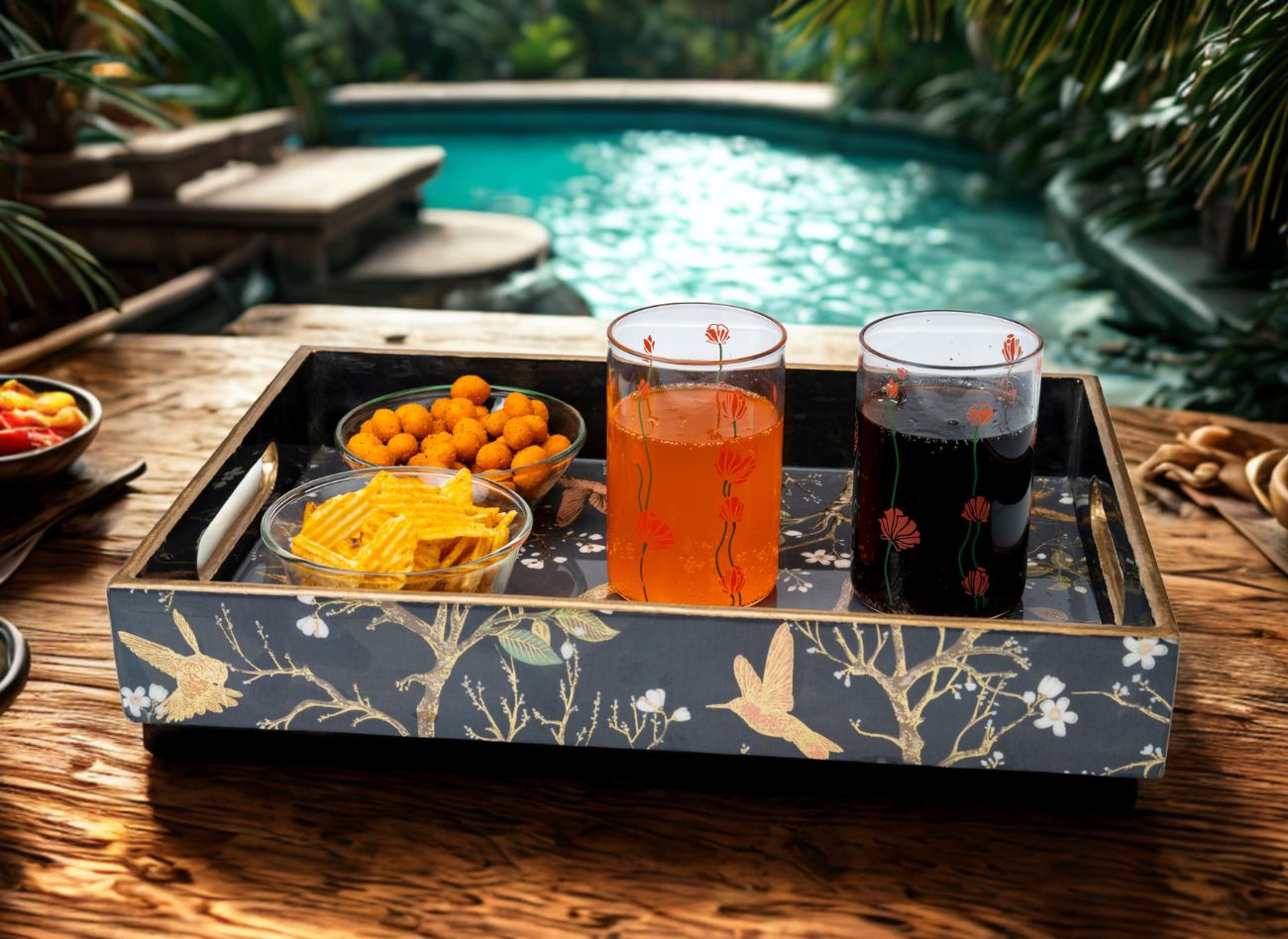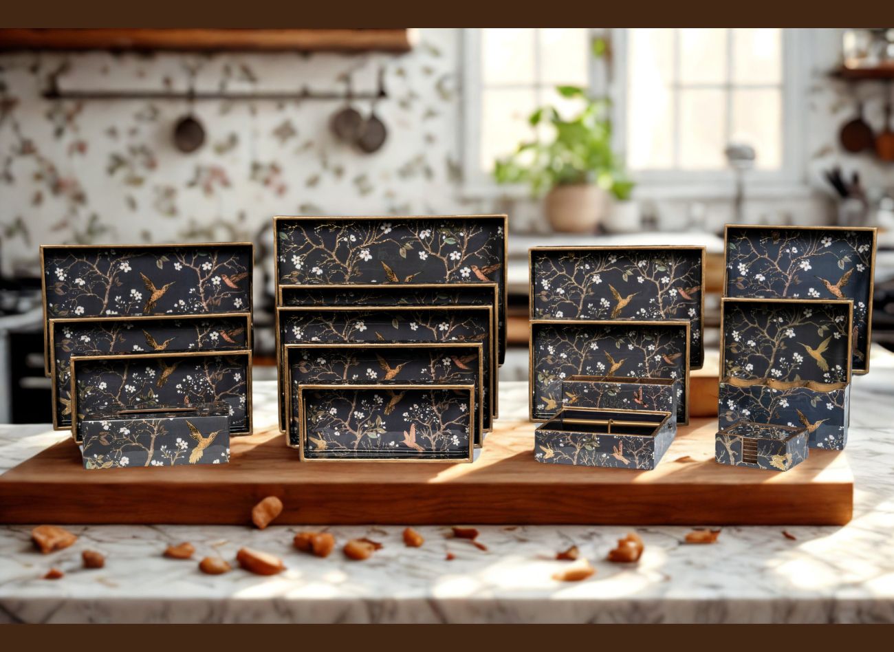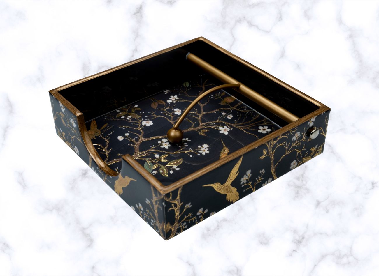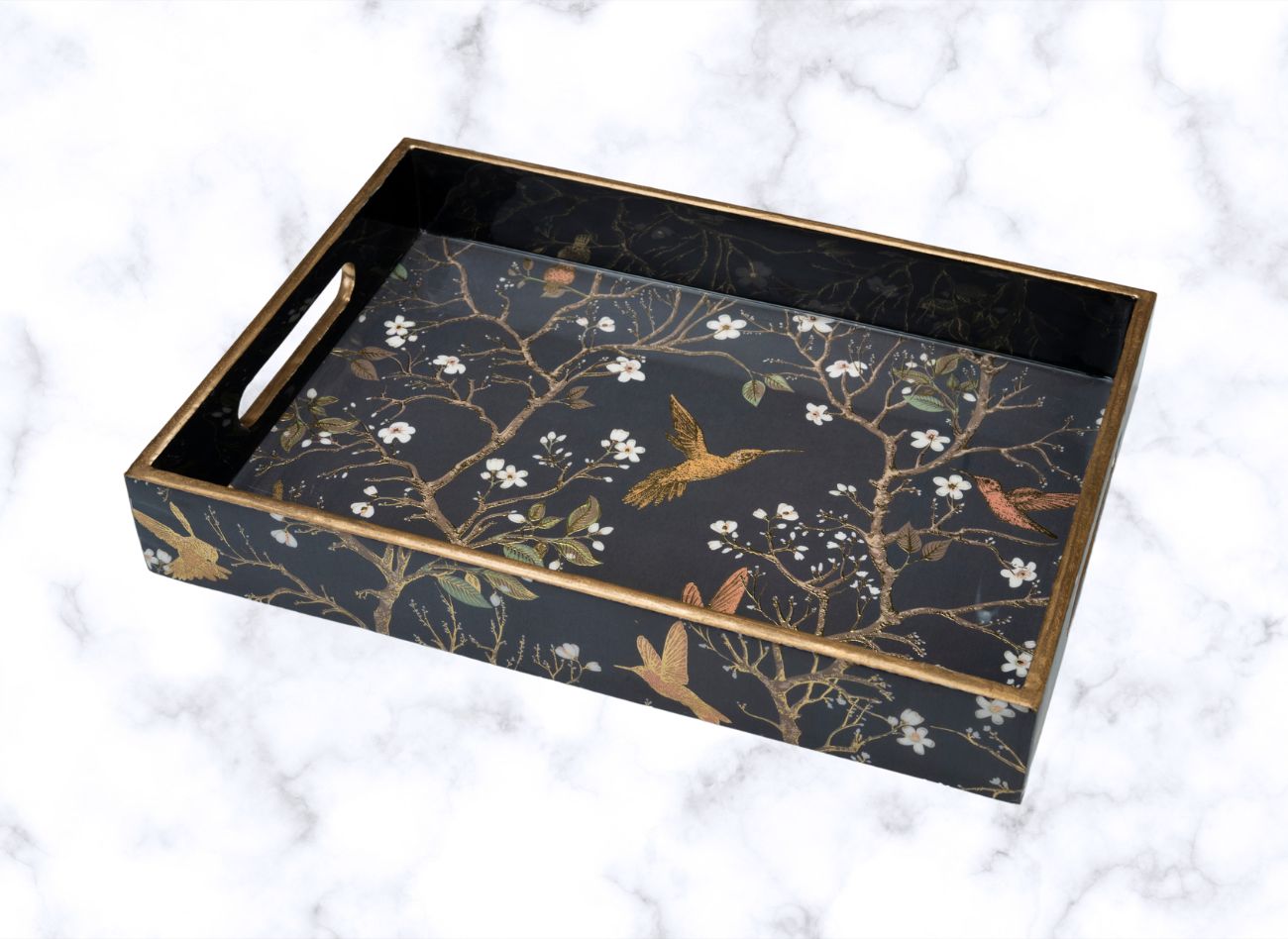 Adorned with blooming white blossoms and golden birds on a deep black canvas, this tray is framed with an antique gold finish to give it a timeless, royal elegance. Perfect for serving or as a decorative piece, it’s more than just a tray—it’s art that speaks of nature’s grace.