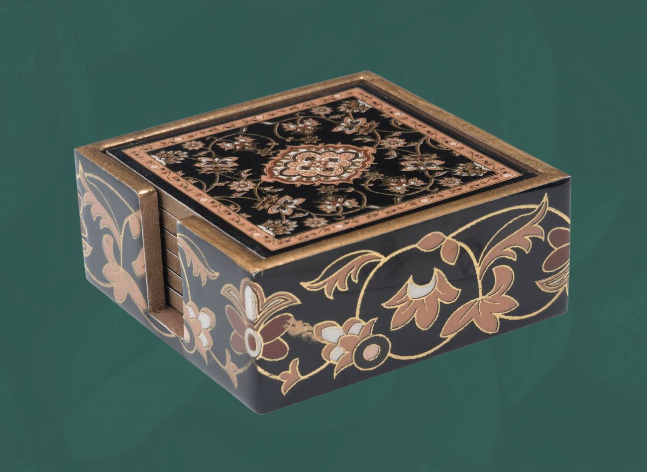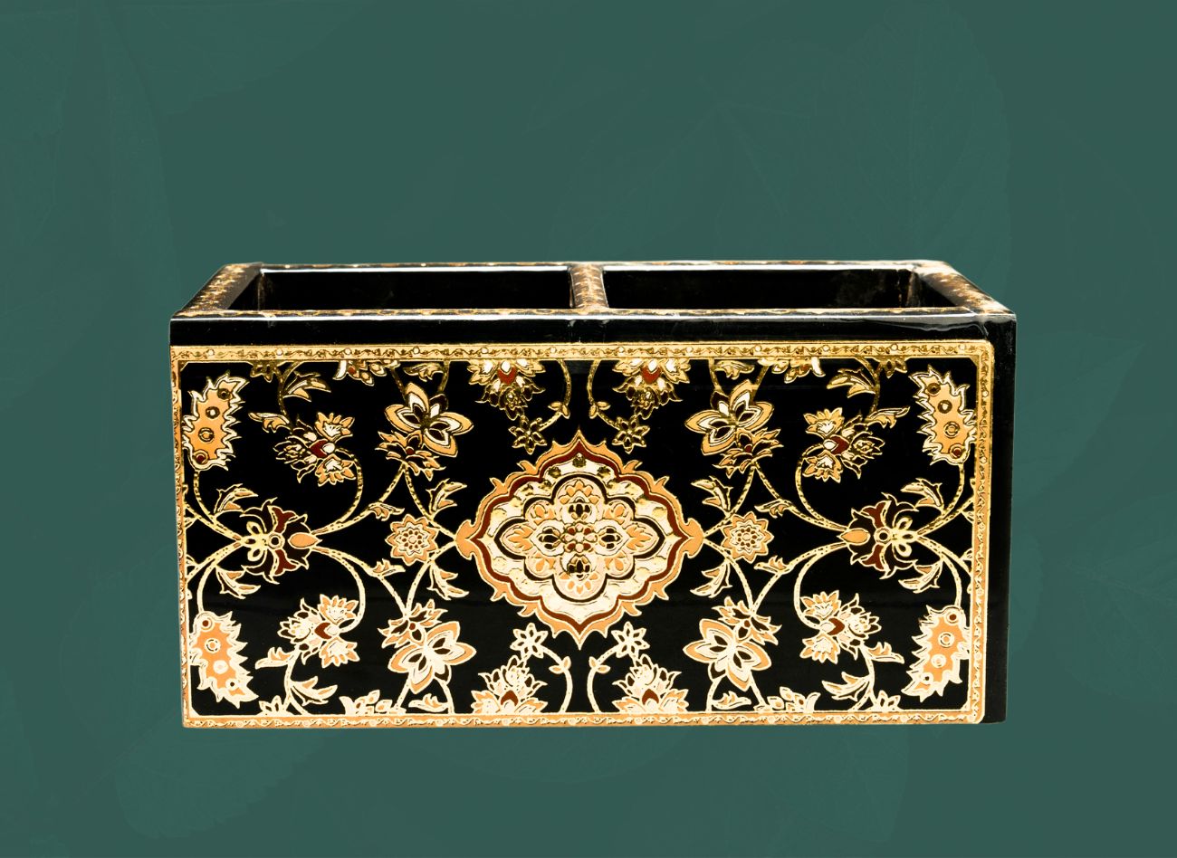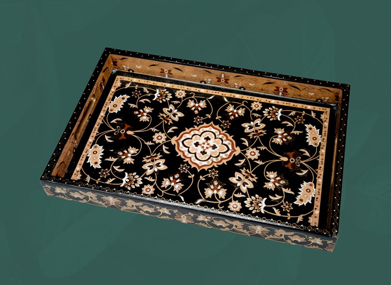 This exquisite handcrafted tray set features a luxurious black base adorned with intricate floral motifs in gold and earthy tones. Inspired by traditional Persian artistry, the design showcases elegant symmetrical patterns, lending an air of regal sophistication. The contrasting gold accents on black enhance the richness of the design, making it perfect for luxury home décor, premium gifting, and elegant serving trays.
