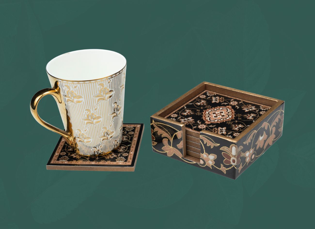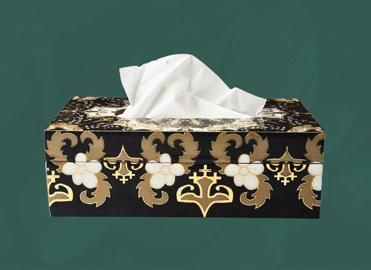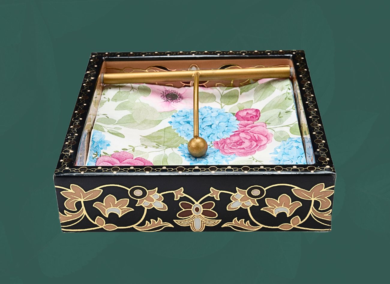 This exquisite handcrafted tray set features a luxurious black base adorned with intricate floral motifs in gold and earthy tones. Inspired by traditional Persian artistry, the design showcases elegant symmetrical patterns, lending an air of regal sophistication. The contrasting gold accents on black enhance the richness of the design, making it perfect for luxury home décor, premium gifting, and elegant serving trays.