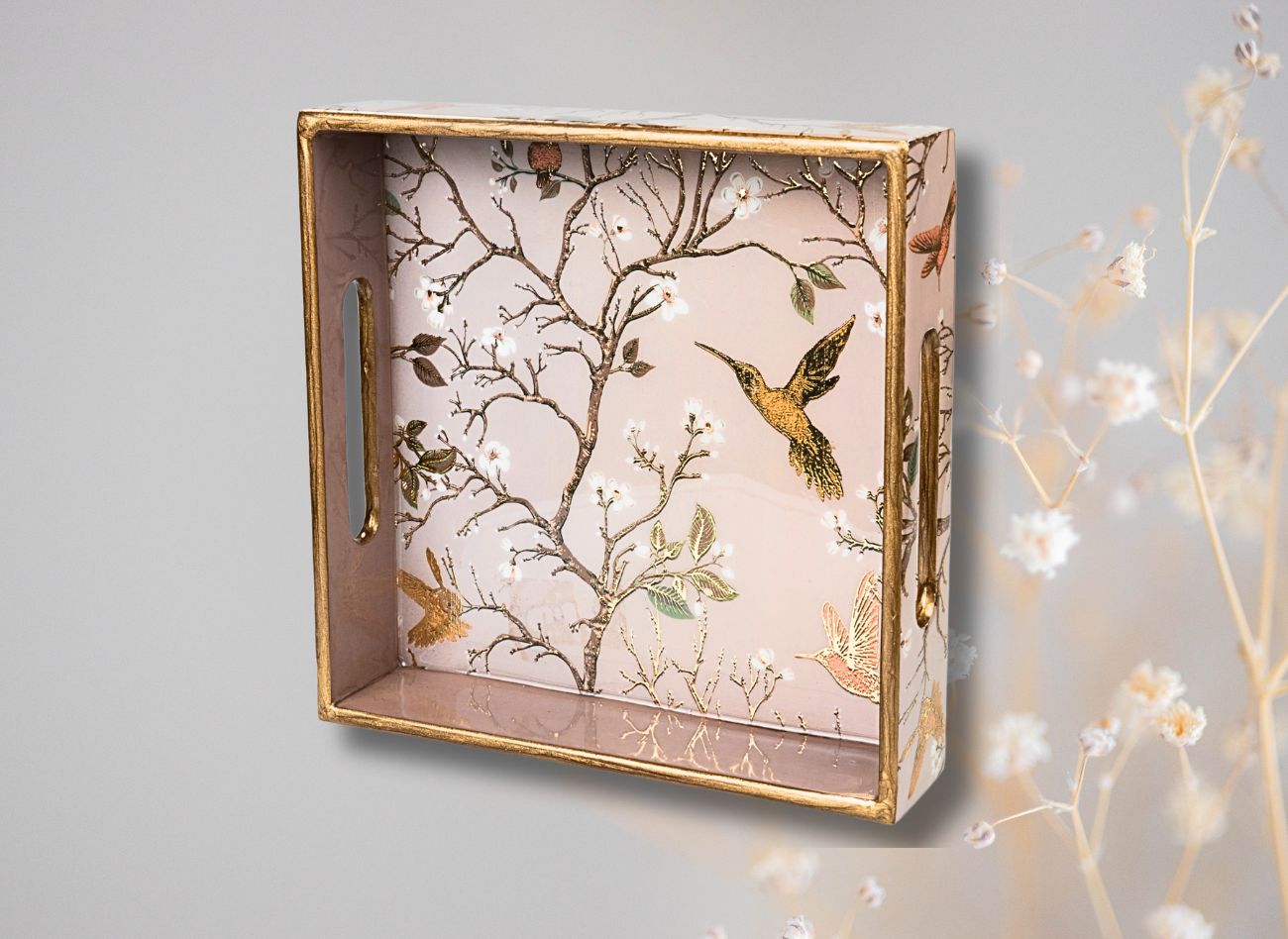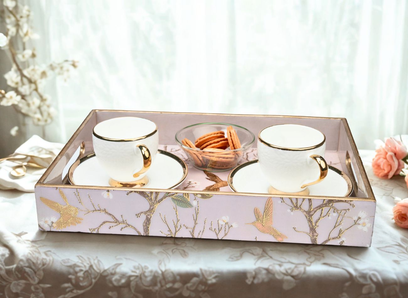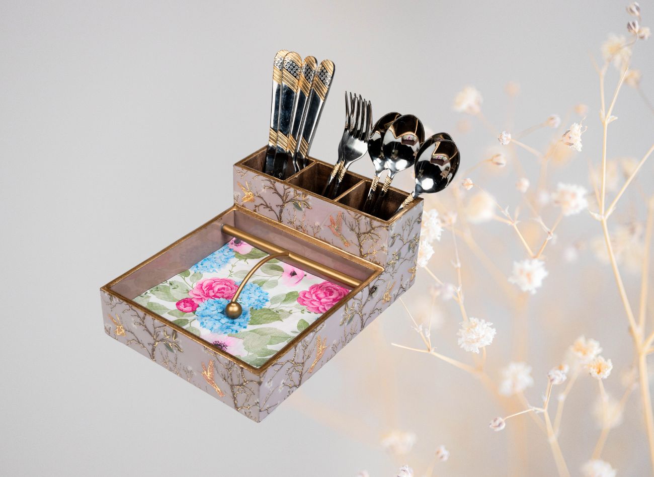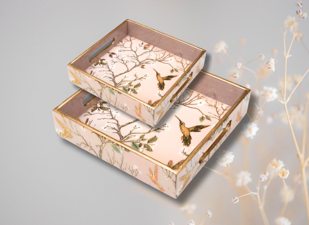 Embrace a soft, feminine charm with the Pink Wing Collection from Daily Talk – a beautiful ensemble of handcrafted utility décor that brings art into your everyday life. Inspired by delicate floral vines and graceful winged patterns in shades of pink and gold, this collection is perfect for those who love elegance with purpose. Crafted from durable engineered wood and finished with detailed foil art under a protective epoxy coating, each piece – from trays to coasters to holders – is made to be as functional as it is beautiful. Whether you’re serving guests or organising your table, Pink Wing adds sophistication to every touchpoint of your home.