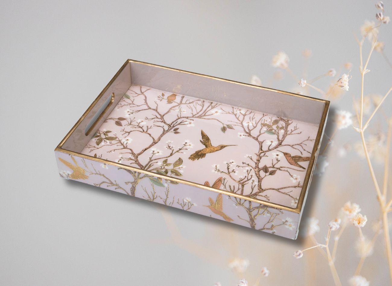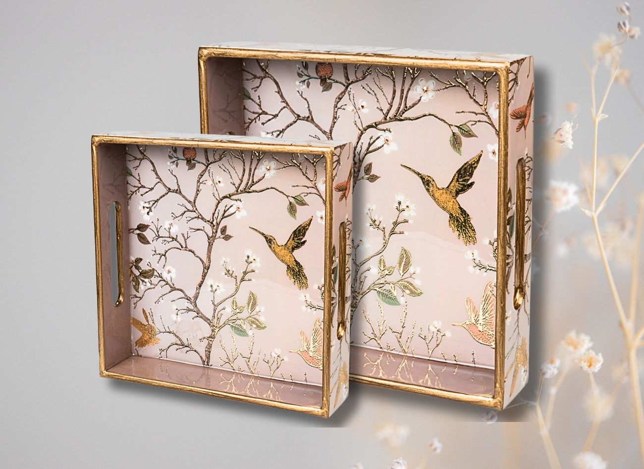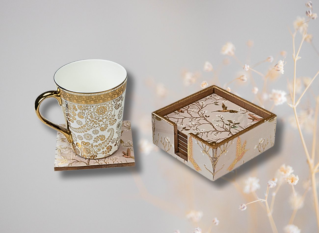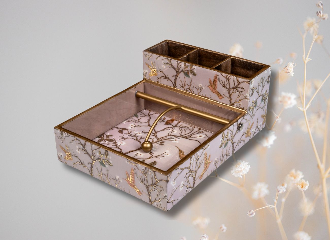 Embrace a soft, feminine charm with the Pink Wing Collection from Daily Talk – a beautiful ensemble of handcrafted utility décor that brings art into your everyday life. Inspired by delicate floral vines and graceful winged patterns in shades of pink and gold, this collection is perfect for those who love elegance with purpose. Crafted from durable engineered wood and finished with detailed foil art under a protective epoxy coating, each piece – from trays to coasters to holders – is made to be as functional as it is beautiful. Whether you’re serving guests or organising your table, Pink Wing adds sophistication to every touchpoint of your home.