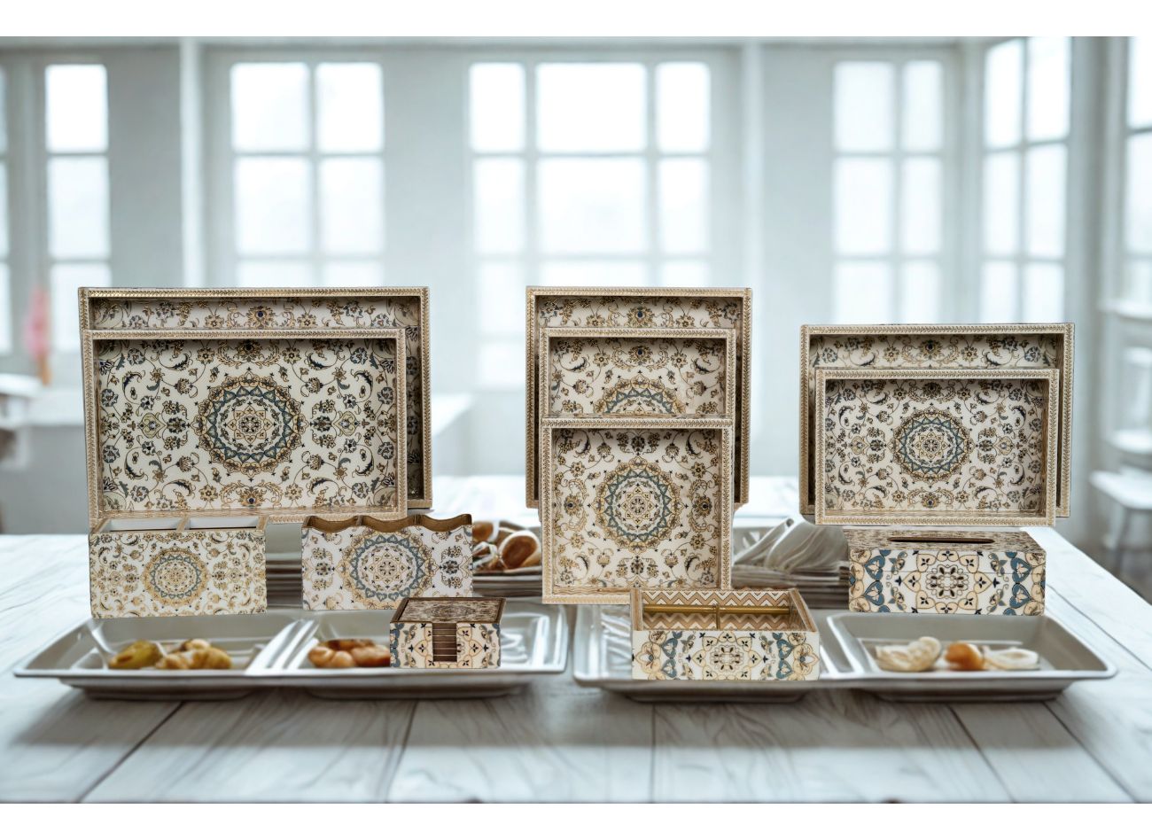 Inspired by the timeless elegance of Indian palatial motifs, the Royal Collection is a stunning ensemble of handcrafted trays and organisers that bring art, heritage, and utility together. Intricately designed with symmetrical floral medallions and bordered with fine detailing, each piece in this collection exudes sophistication and charm. Whether used for serving guests, organising essentials, or as a decor highlight, this collection instantly adds a regal touch to any setting. It is ideal for festive gifting, formal occasions, and everyday elegance.