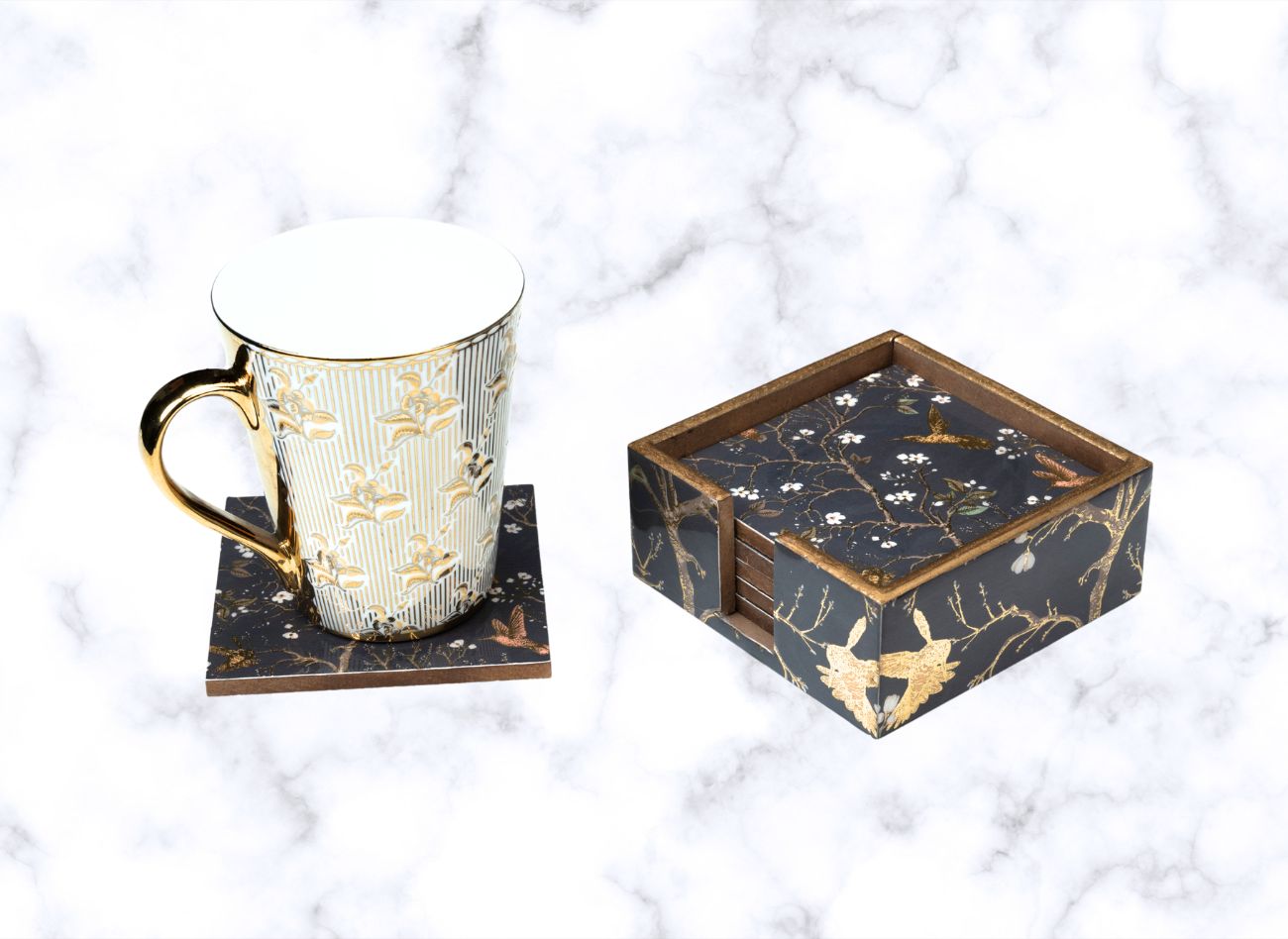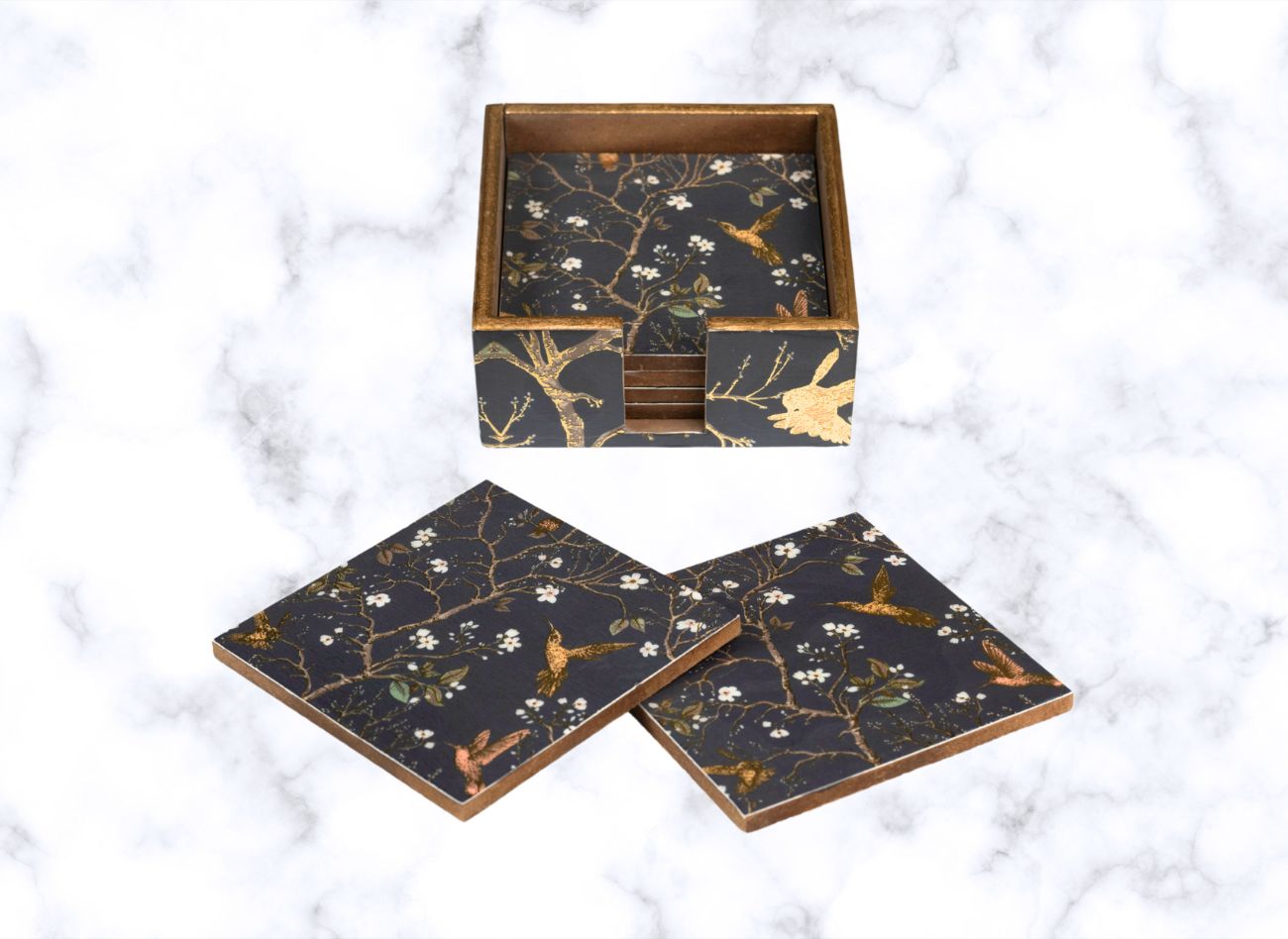 Add a splash of sophistication to your table with the Pink Wing Coaster Set. This 6-piece handcrafted wooden coaster set features a serene blush backdrop adorned with delicate floral branches and golden birds in flight. Designed to protect your surfaces from stains and spills, each coaster is coated with a water-resistant finish and comes neatly packed in a matching storage box. A perfect blend of beauty and functionality, this set makes a charming addition to your home décor and an elegant gift for any occasion.