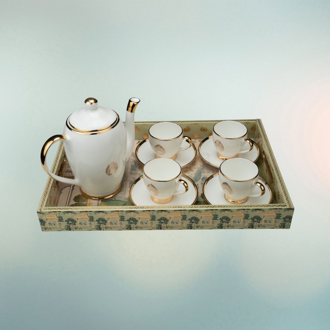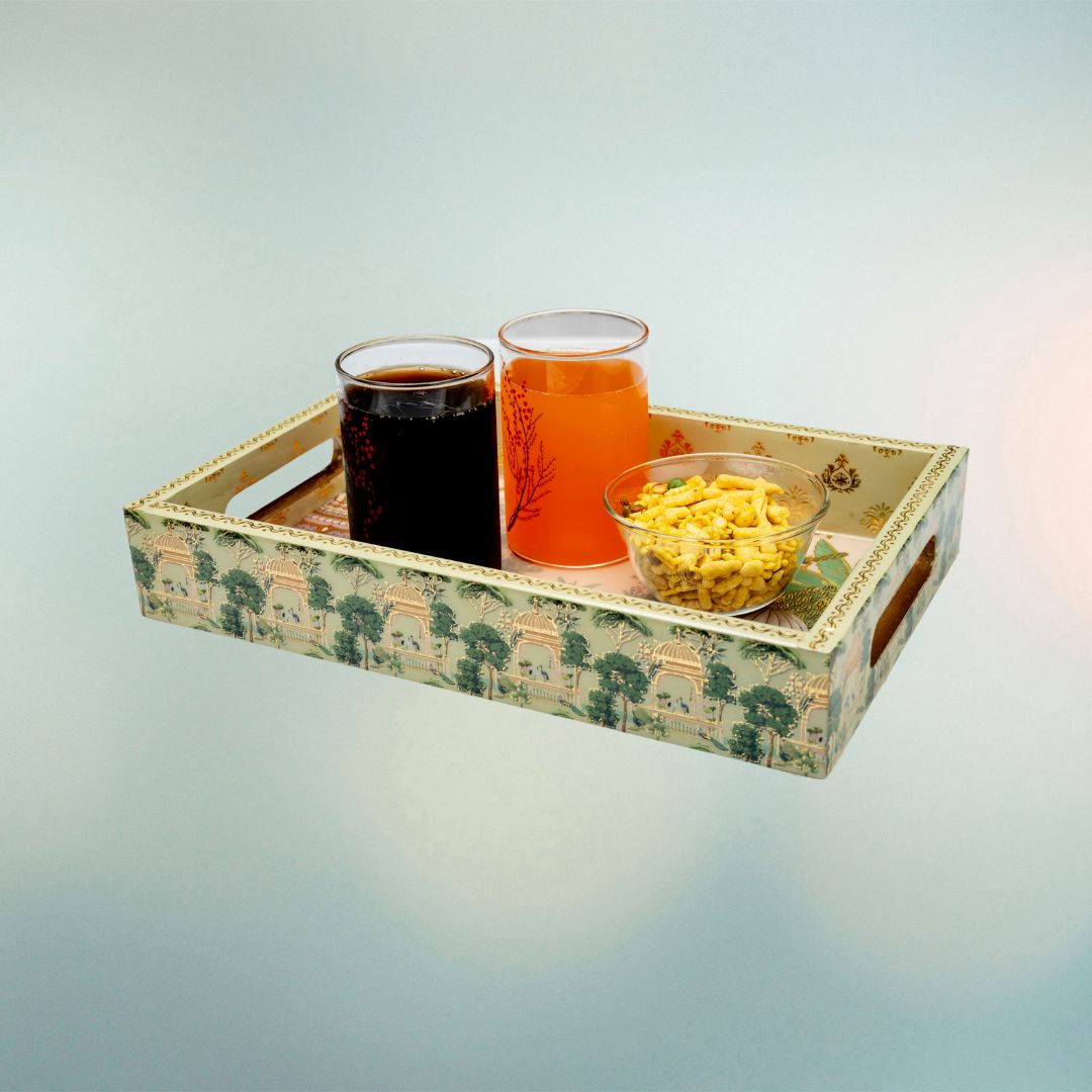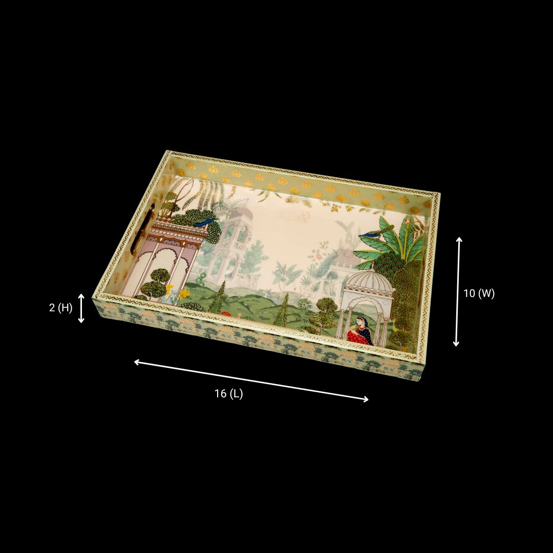 This stunning handcrafted tray set brings to life a scene from a royal palace garden. Featuring an elegantly dressed noblewoman seated in a lush courtyard, the artwork is enriched with detailed architecture, vibrant greenery, and majestic peacocks. Soft pastels, gold highlights, and intricate hand-painted detailing evoke a sense of grandeur and nostalgia. The delicate border work adds a touch of sophistication, making this set ideal for luxury home décor, serving in style, or gifting with a royal touch.