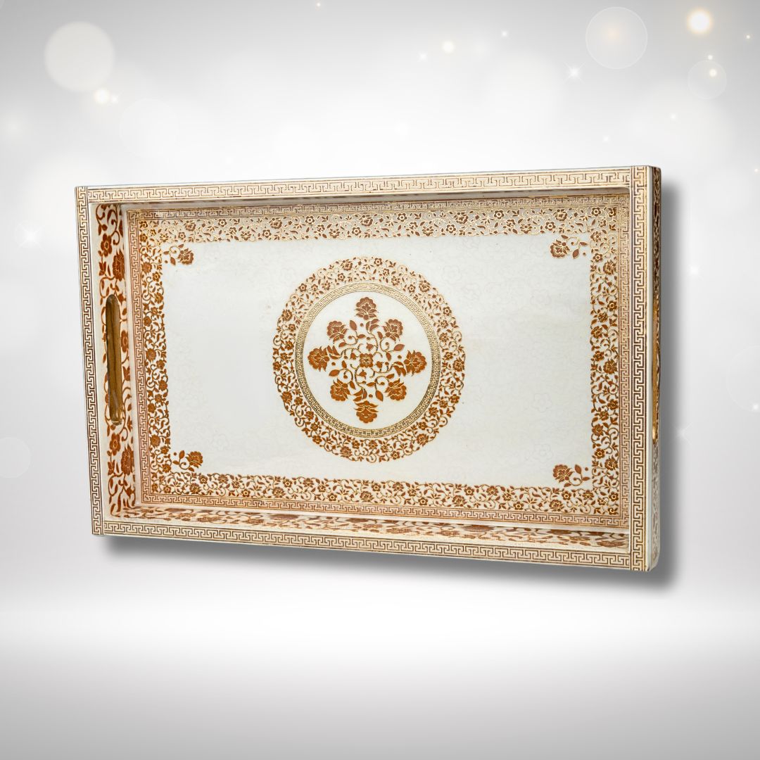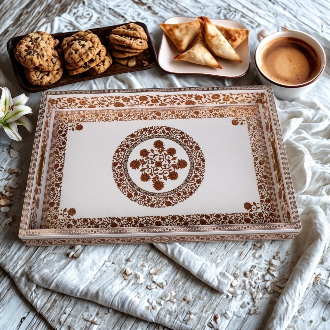 This luxurious wooden foiling tray set features an elegant fusion of white and gold, exuding a royal charm. The intricate floral motifs and symmetric circular patterns are reminiscent of Mughal-era artistry, lending an opulent touch to your serveware. The set includes rectangular and square trays, matching accessories like a tissue box, coasters, a cutlery organiser, and a storage box, making it a perfect ensemble for premium dining experiences.