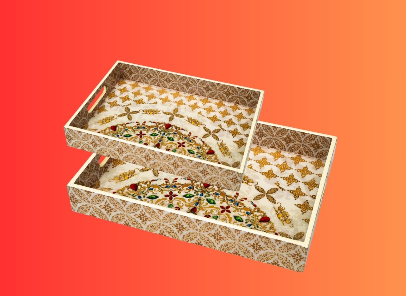 This luxurious wooden foiling tray set features a regal and ornate design, inspired by royal palatial decor. The intricate golden patterns, enhanced with rich red, green, and blue jewel-like accents, exude elegance and sophistication. The delicate floral motifs and symmetrical detailing reflect classic Mughal and Persian artistry, making this tray perfect for grand celebrations, festive occasions, or elegant home décor. The ivory-toned borders add a touch of timeless charm, complementing its overall opulent aesthetic.
