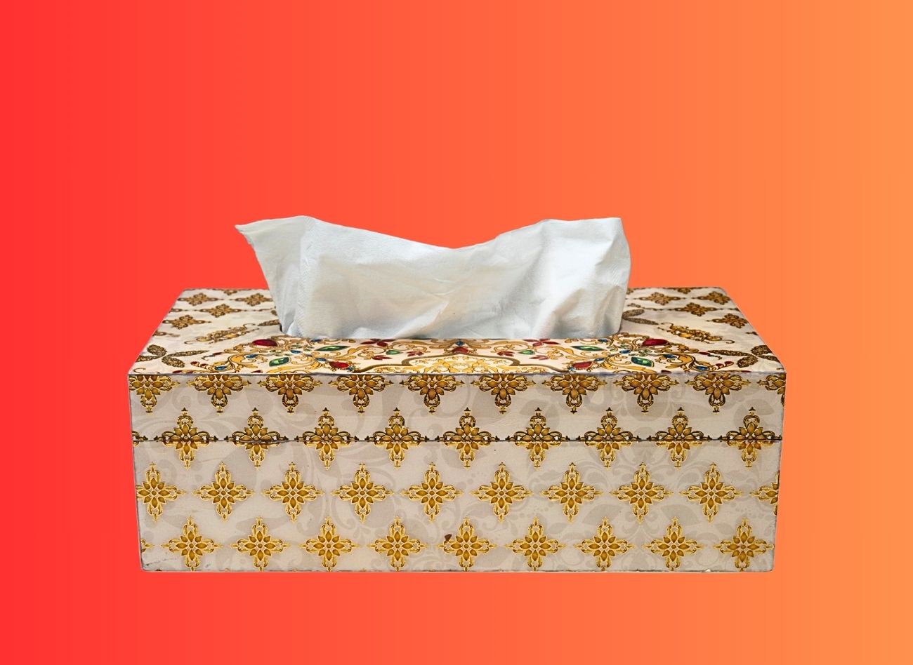 Elevate your table décor with the Ornate Tissue Box, designed with intricate foil work and a rich blue-gold palette. This handcrafted piece blends form and function, offering a stylish solution for your tissue needs.