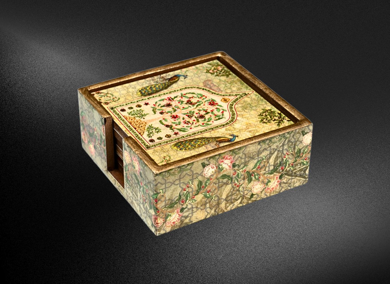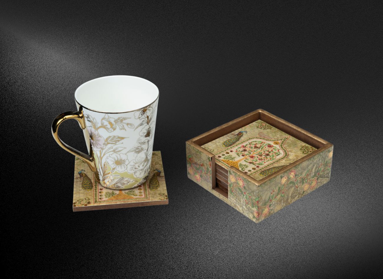 Turn every tea break into a royal affair with our Peacock Coaster Set – a fusion of Indian heritage and modern elegance. Each coaster features intricate foil-printed artwork inspired by majestic peacocks and Mughal archways, printed on durable engineered wood (MDF) and finished with a glossy epoxy resin coat for long-lasting protection. This set of 6 coasters comes neatly packed in a matching holder, offering a clutter-free and decorative addition to your coffee table, sideboard, or office desk. Whether you’re serving chai or champagne, these coasters protect surfaces with style and substance.